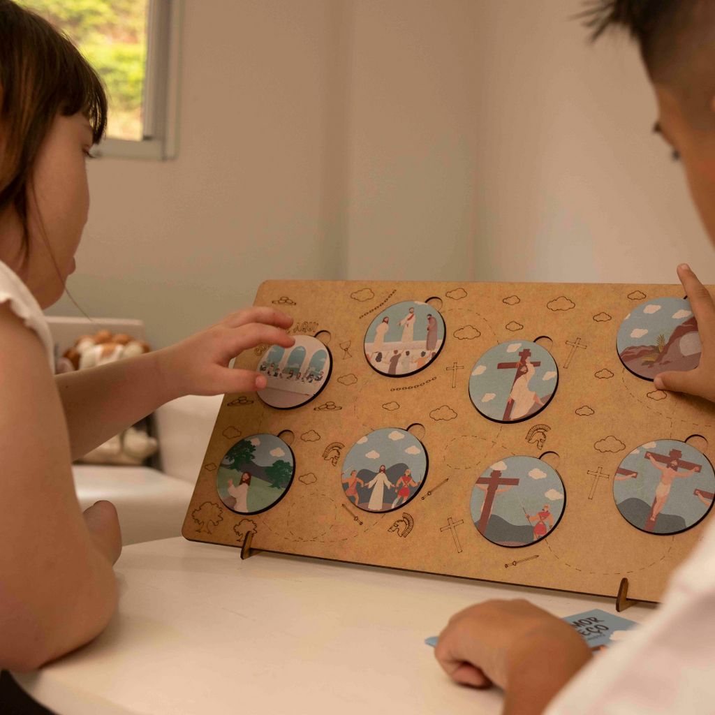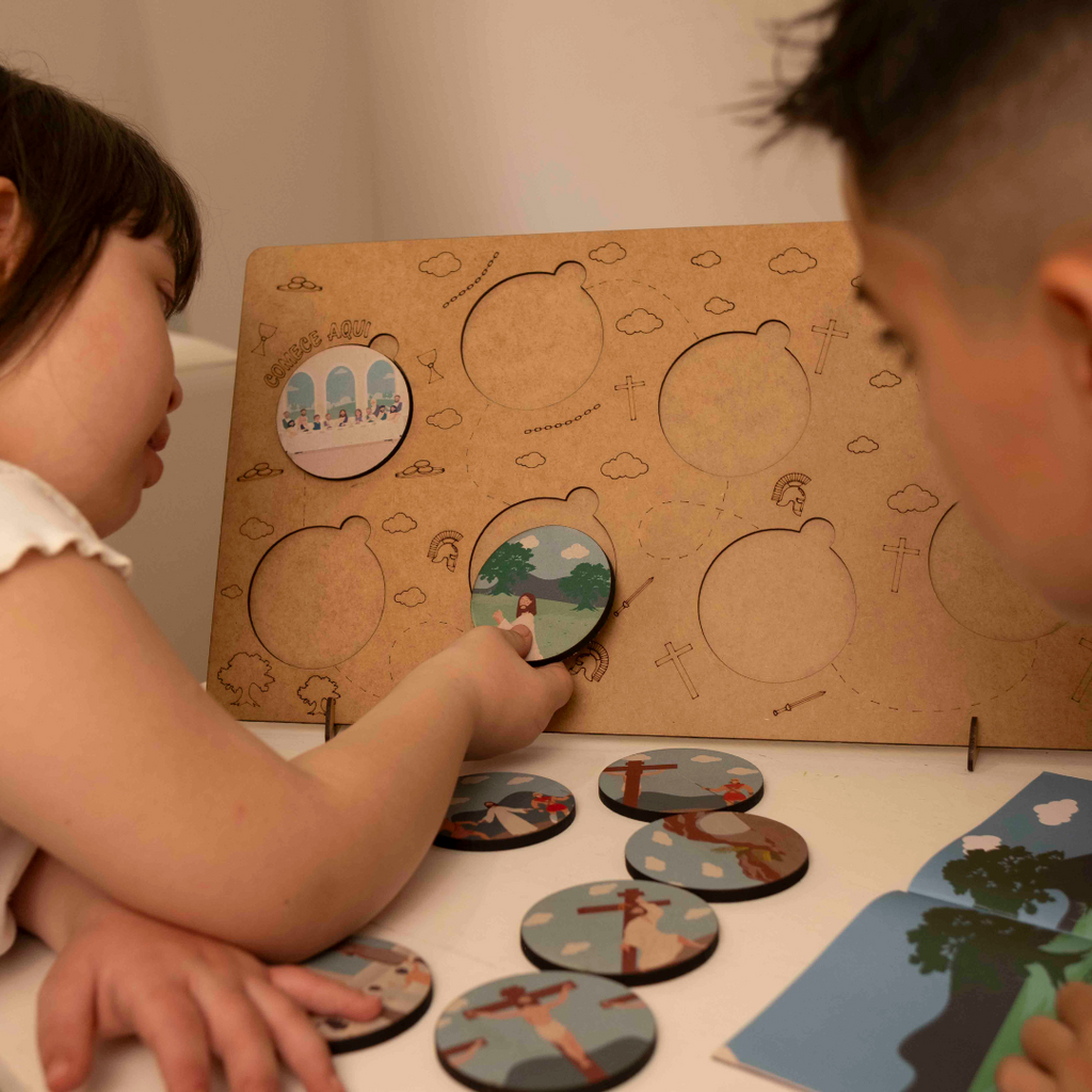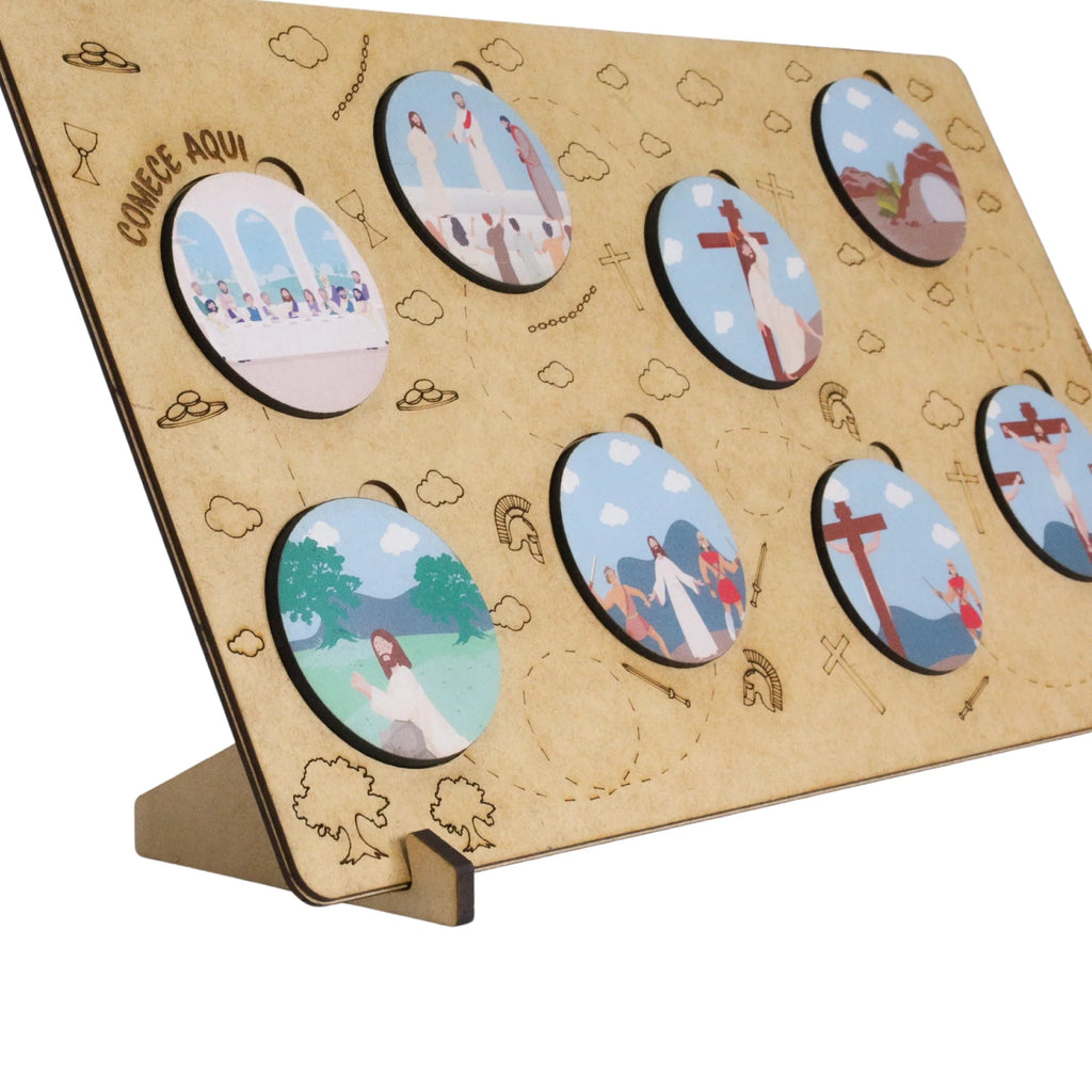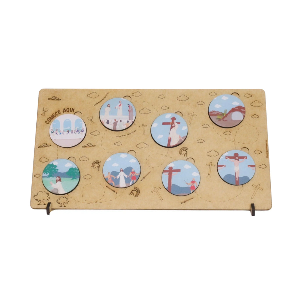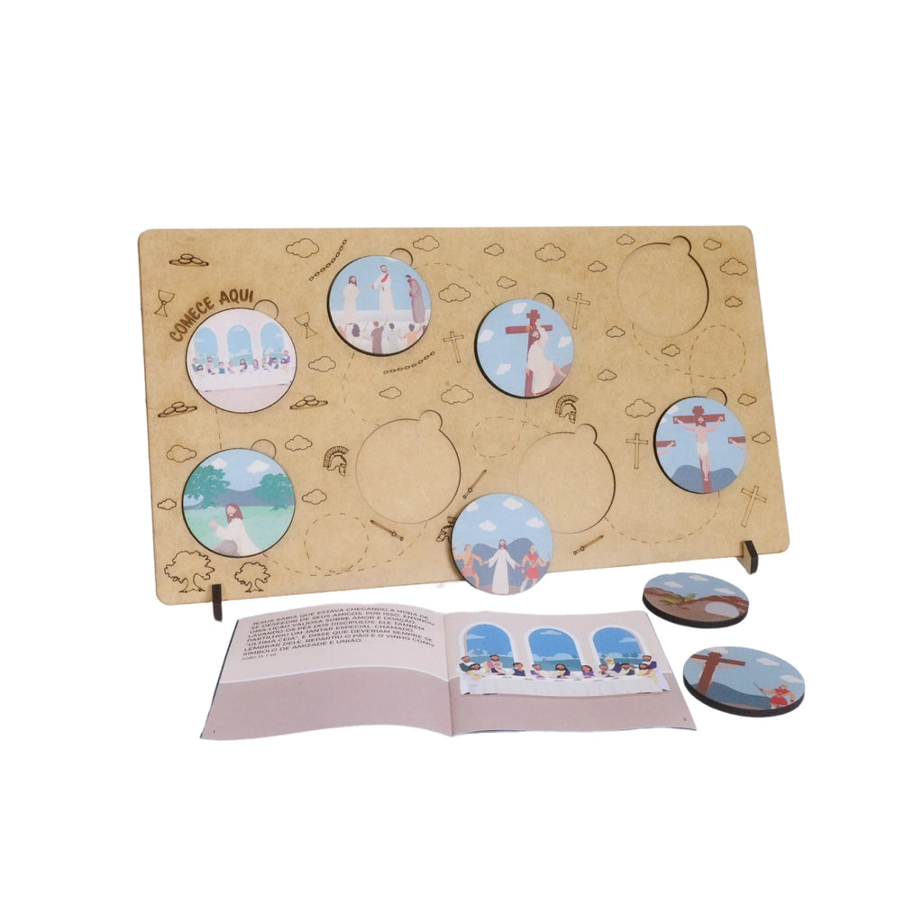 Acompanha: Base + 8 peças para encaixe + livreto com a história da Crucificação de Jesus Cristo + suporte