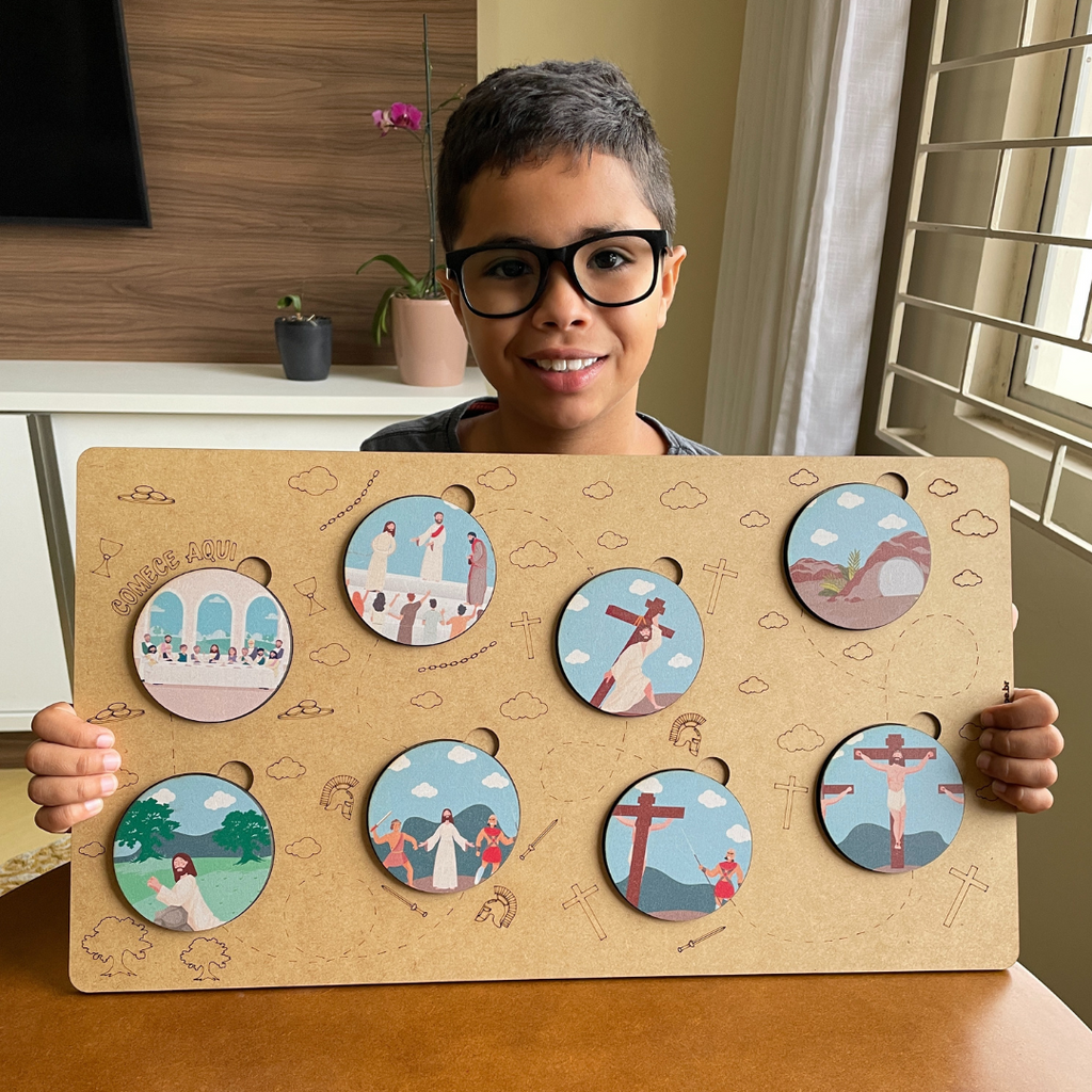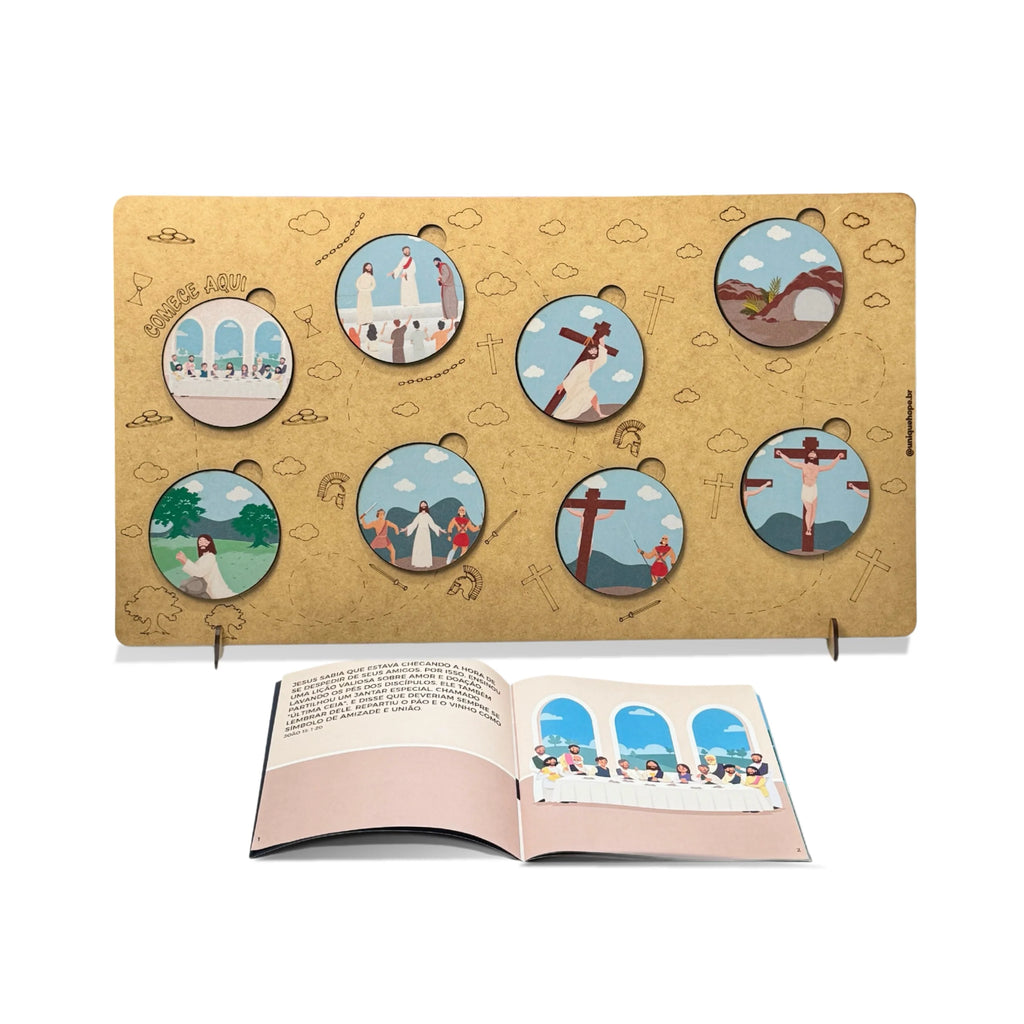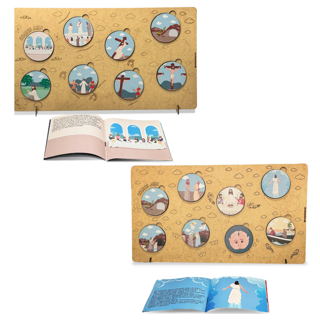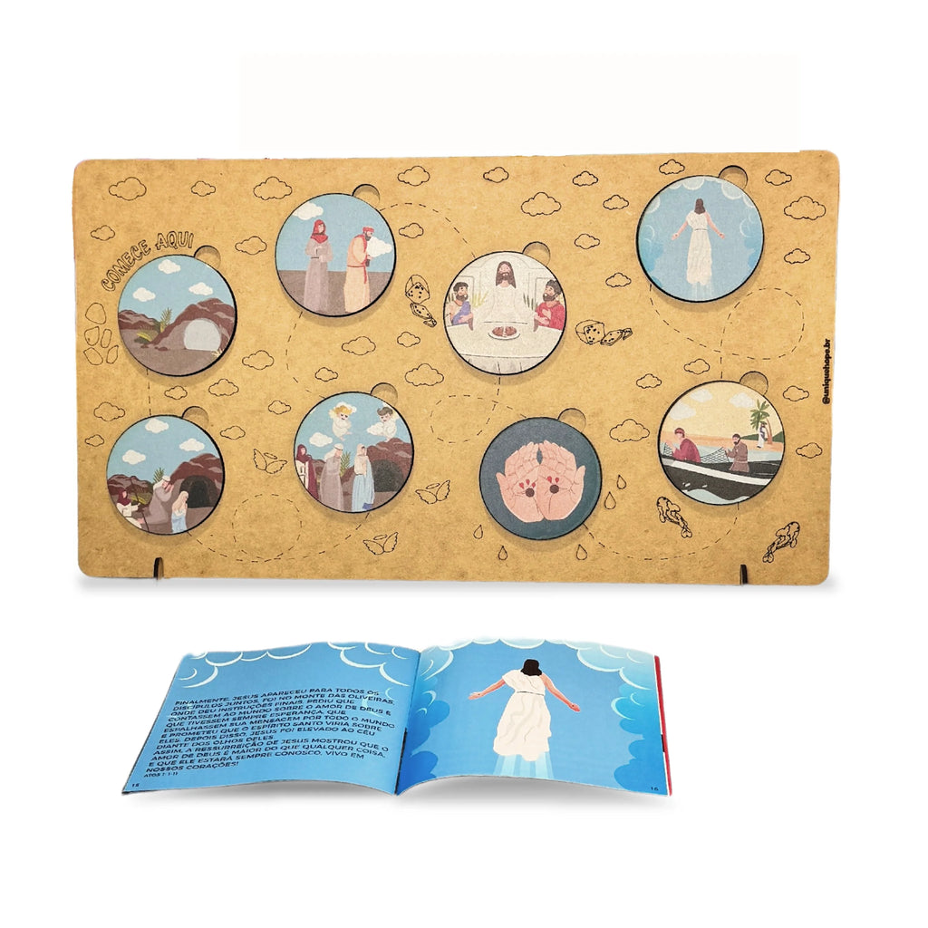 Jogo 02: Base + 8 peças para encaixe + livreto com a história da Ressurreição de Jesus Cristo + suporte