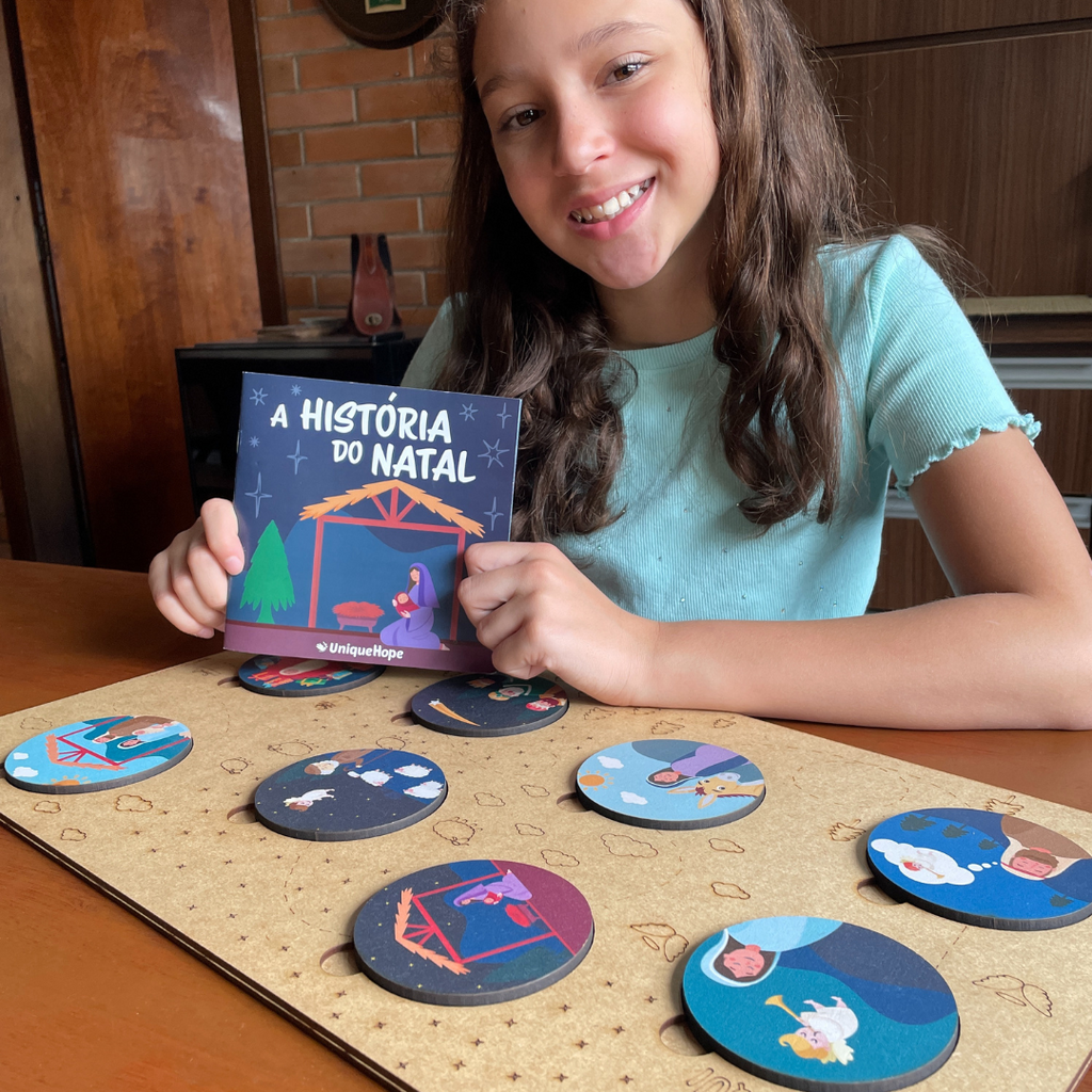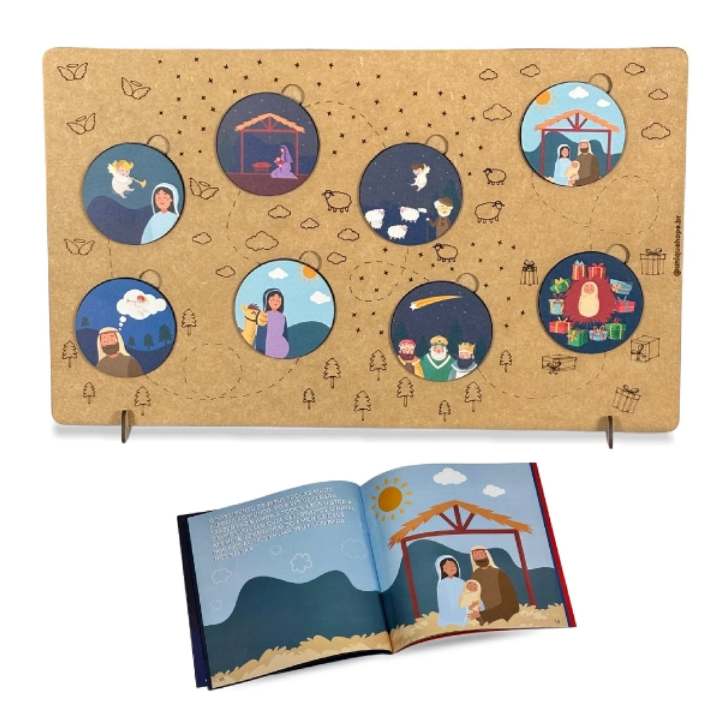 Jogo 01: Base + 8 peças para encaixe + livreto com a história do Nascimento de Jesus Cristo + suporte