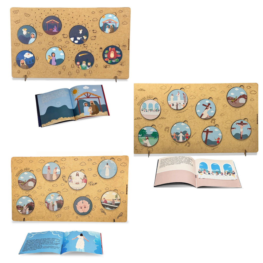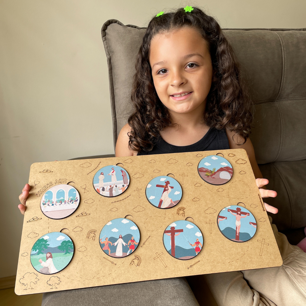 Jogo 03: Base + 8 peças para encaixe + livreto com a história da Ressurreição de Jesus Cristo + suporte