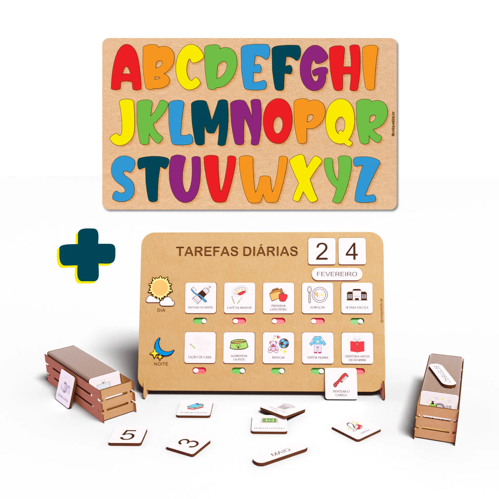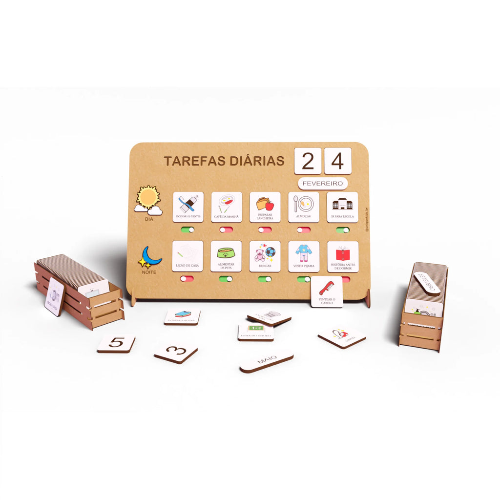 Acompanha: Quadro Tarefas Diárias com suporte e 31 cards pré-definidos + 3 cards em branco para personalizar como desejar, meses do ano e dias do mês. Quadro tem botão interativo para que a criança possa sinalizar o que já realizou.