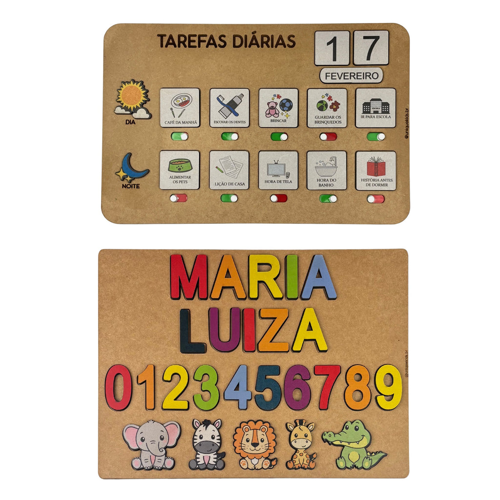 Acompanha: Quadro Tarefas Diárias com suporte e 31 cards pré-definidos + 3 cards em branco para personalizar como desejar, meses do ano e dias do mês. Quadro tem botão interativo para que a criança possa sinalizar o que já realizou.