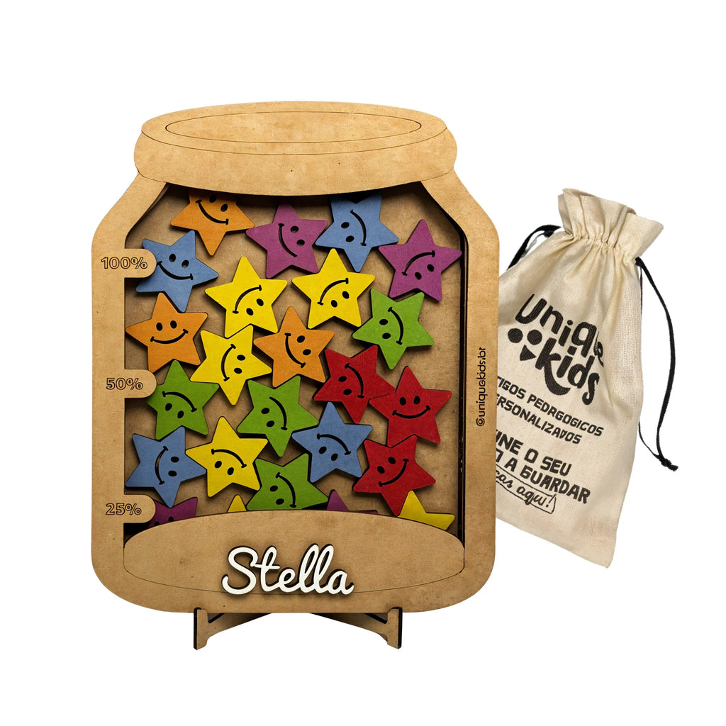 Acompanha: Pote da conquista personalizado com nome, suporte de apoio e 32 estrelas coloridas