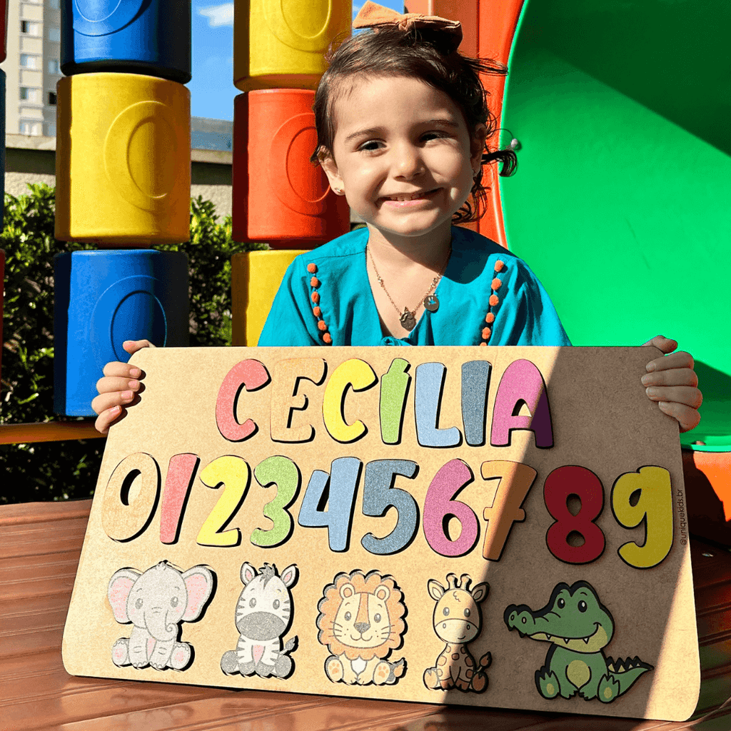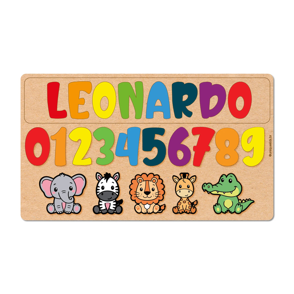 Acompanha: Base + Nome Personalizado + números do 0 ao 9 + animais (elefante, zebra, leão, girafa, jacaré) - NÃO ACOMPANHA SUPORTE